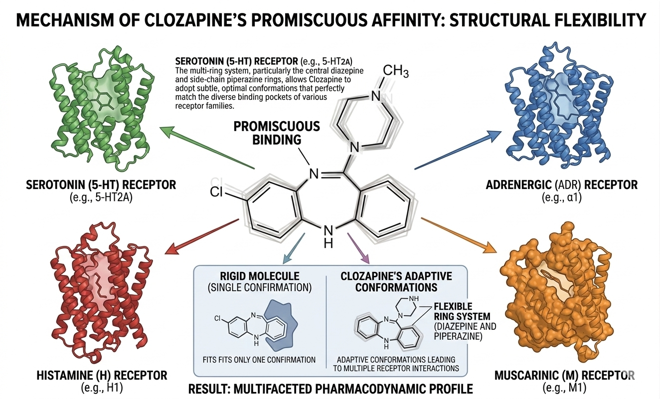 多様な親和性: セロトニン、アドレナリン、ヒスタミン、ムスカリンなど、多岐にわたる受容体と相互作用する。これは中央のジアゼピン環と側鎖のピペラジン環が、それぞれの受容体に合わせて微妙に角度を変えられる構造的なゆらぎを持っているため。