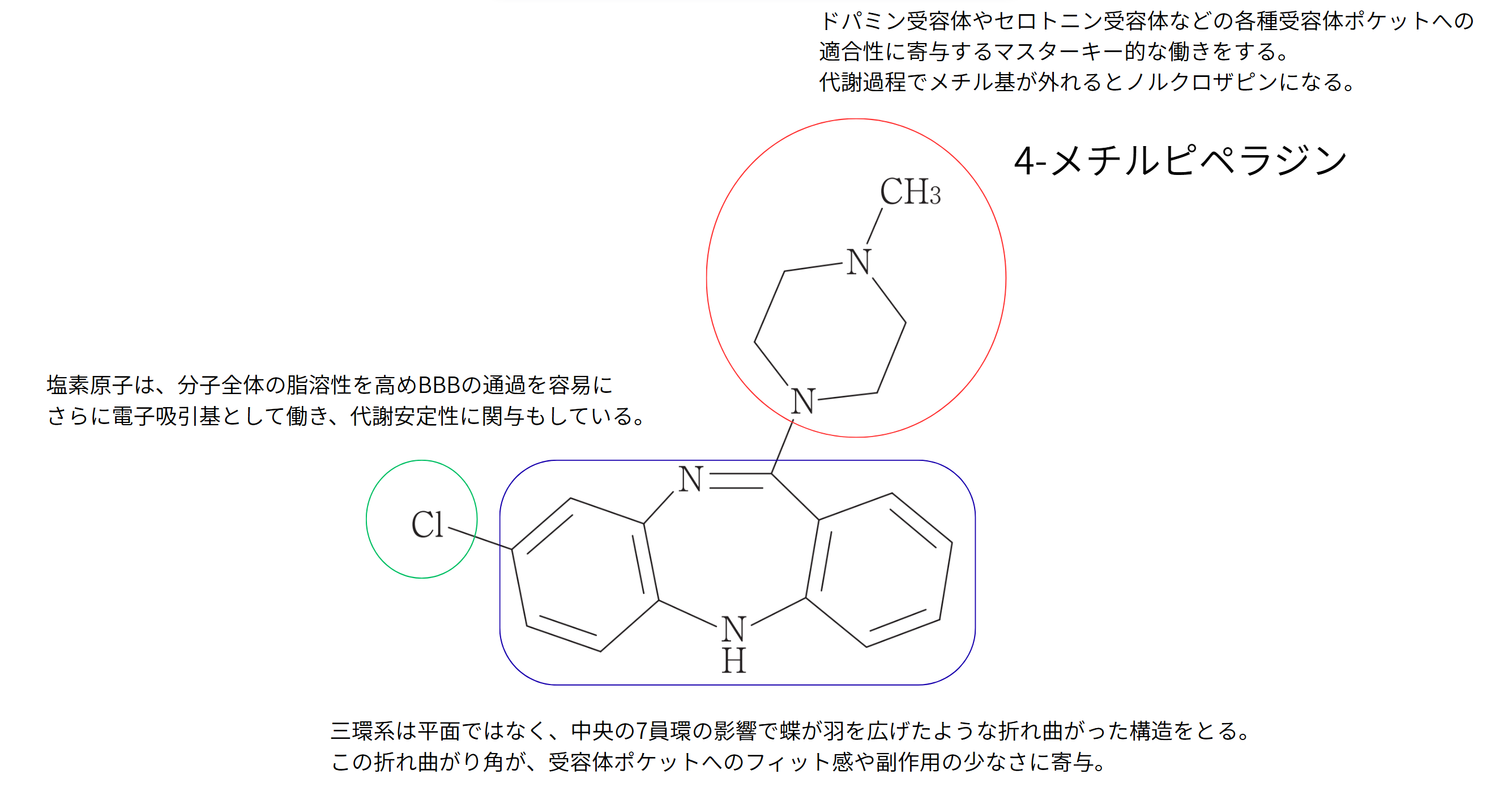 宗匠、ご覧くだされ。これがクロザピンという薬の形にございます。中央の七員環がひしゃげて、まるで蝶が羽を広げたような不格好な歪みを持っておりますな。