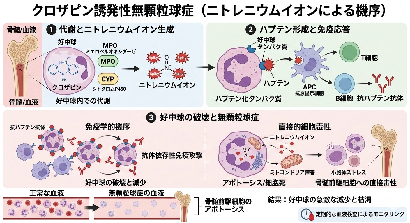 毒性メカニズムは完全には解明されていないが、クロザピンが代謝される過程で生じる反応性代謝物(ニトレニウムイオンなど)による骨髄毒性や、免疫介在性の反応が関与していると考えられている。