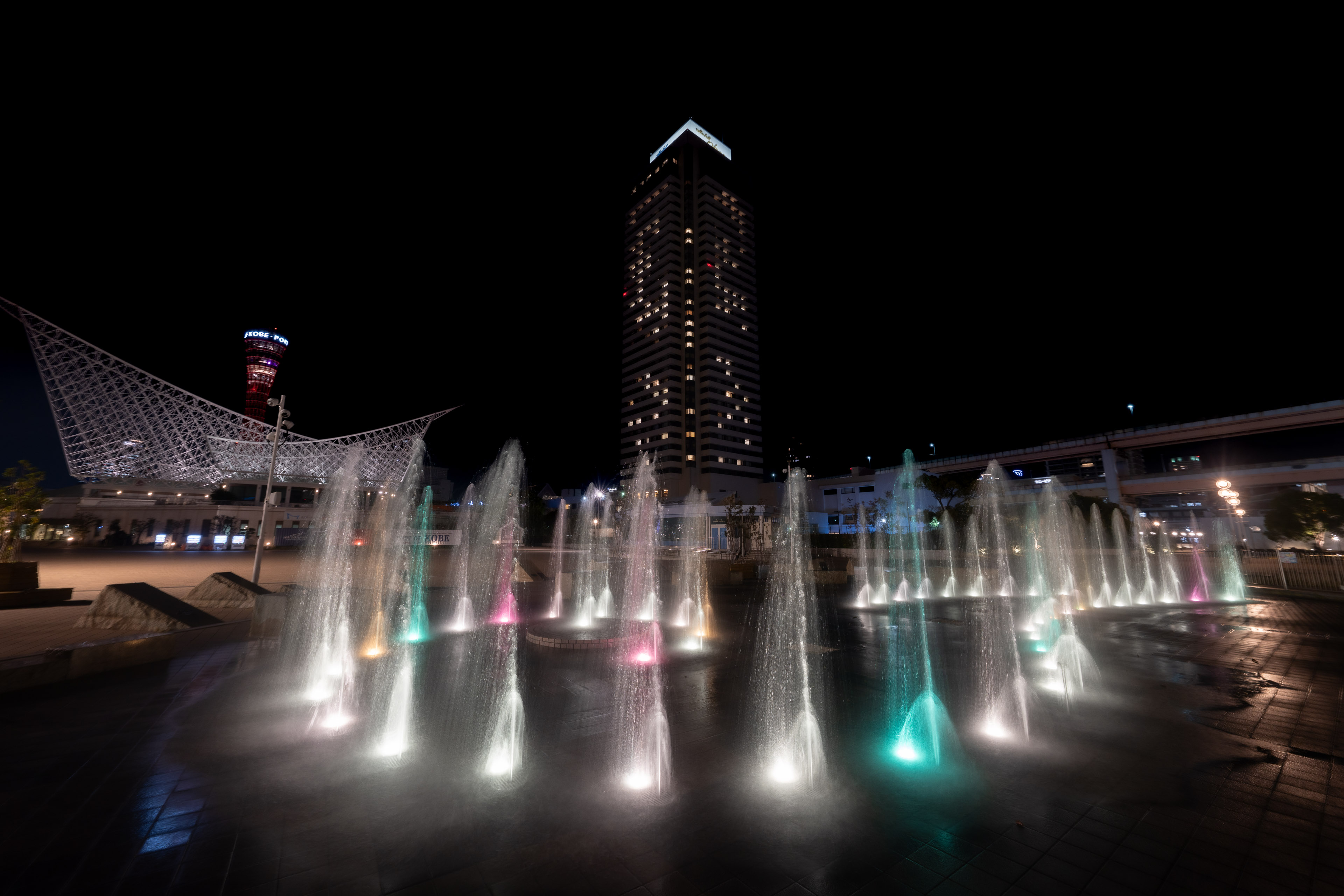写真 【神戸】ハーバーランド:弾ける光の粒に触れる。噴水の水しぶきが宝石のように輝く夜の広場