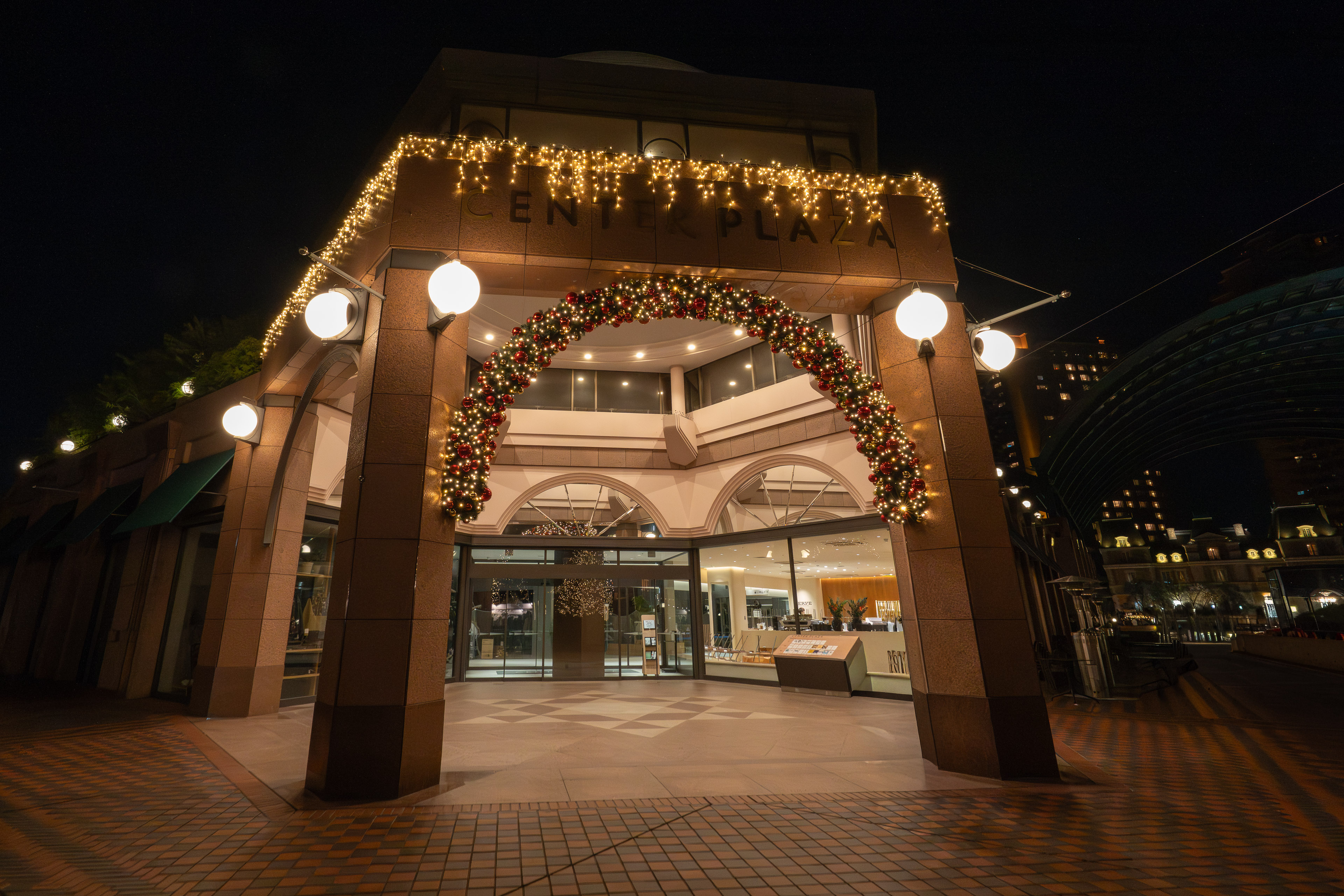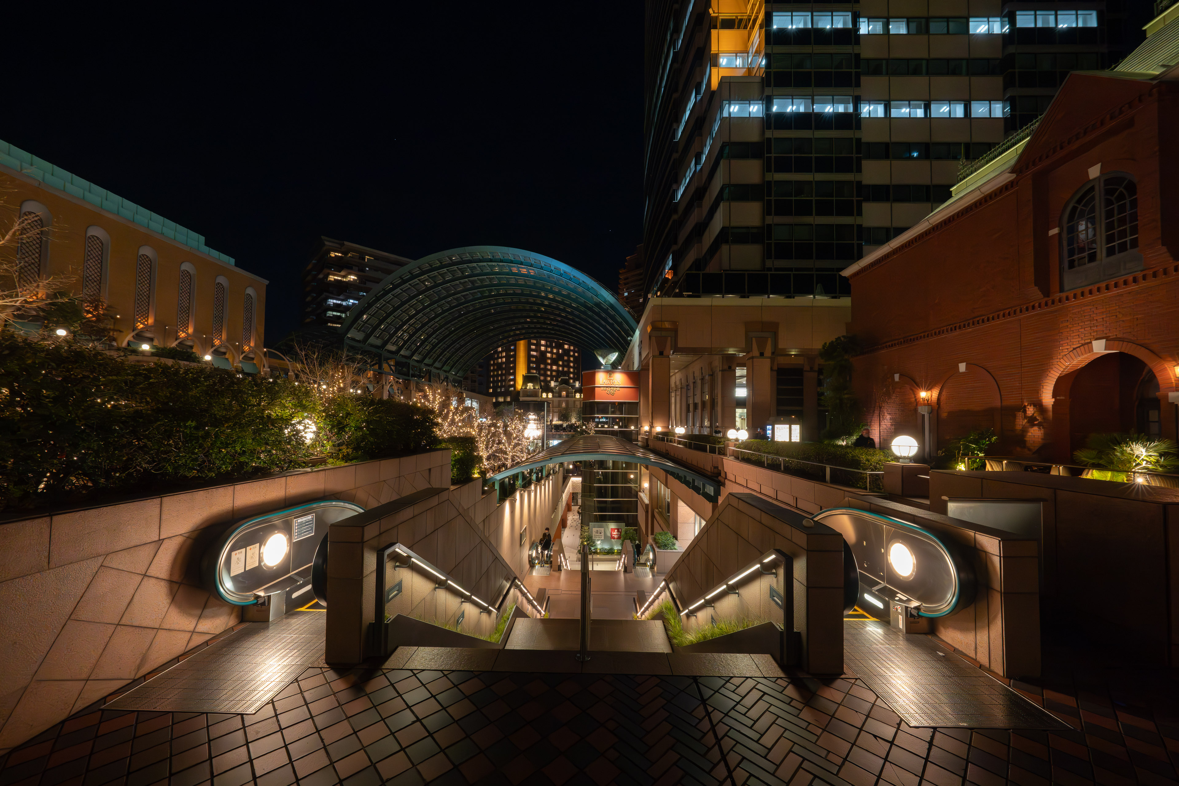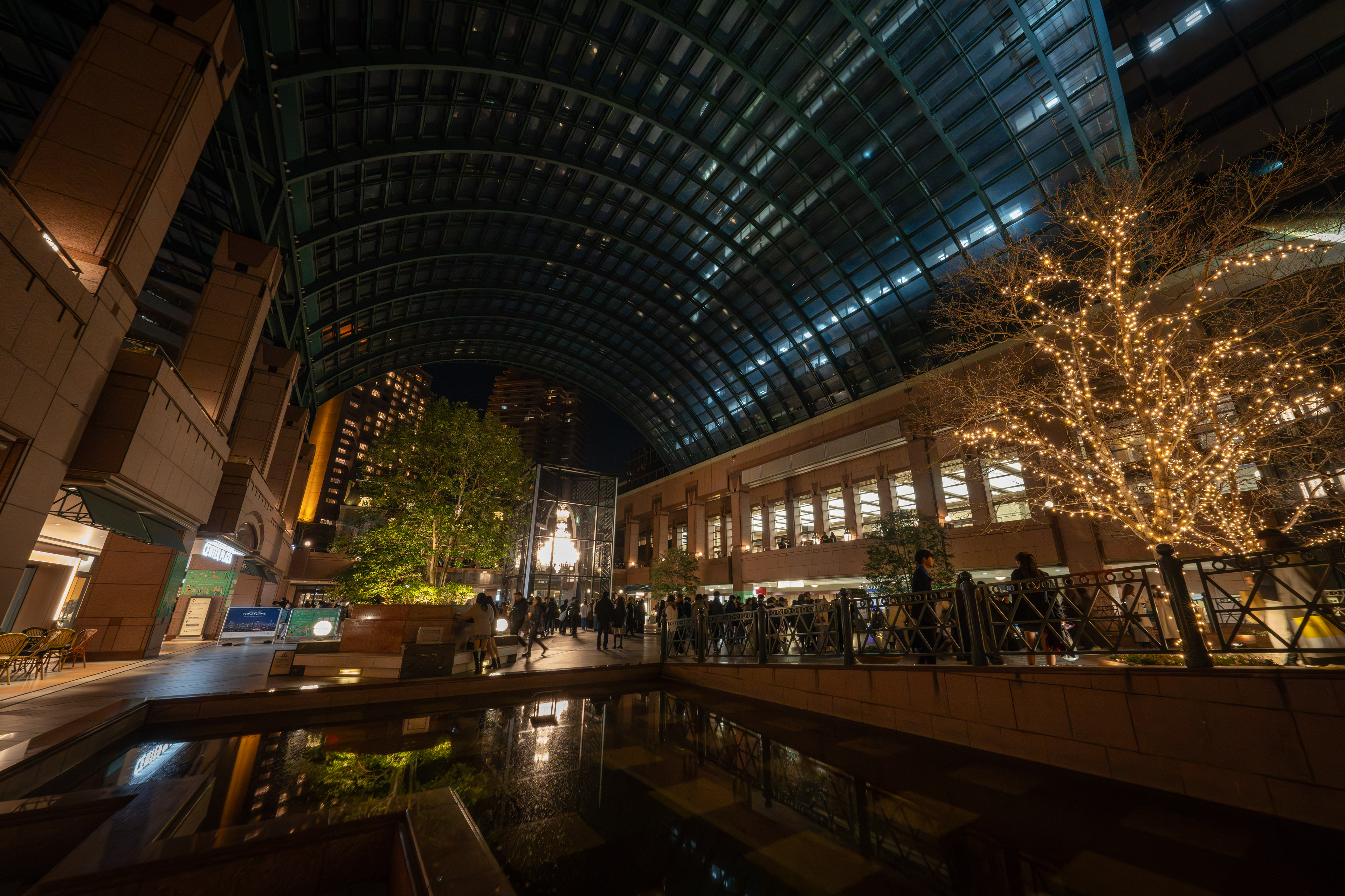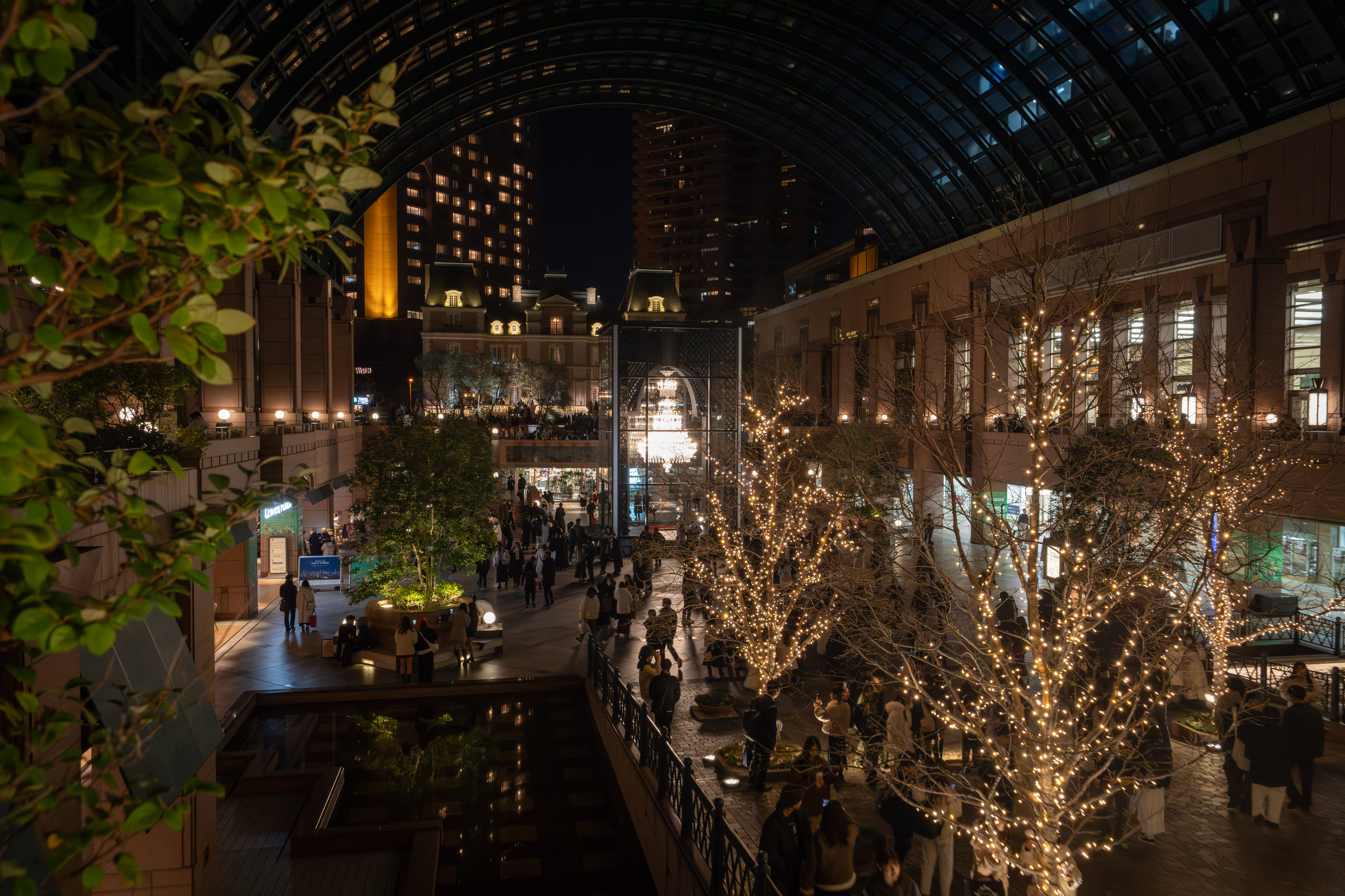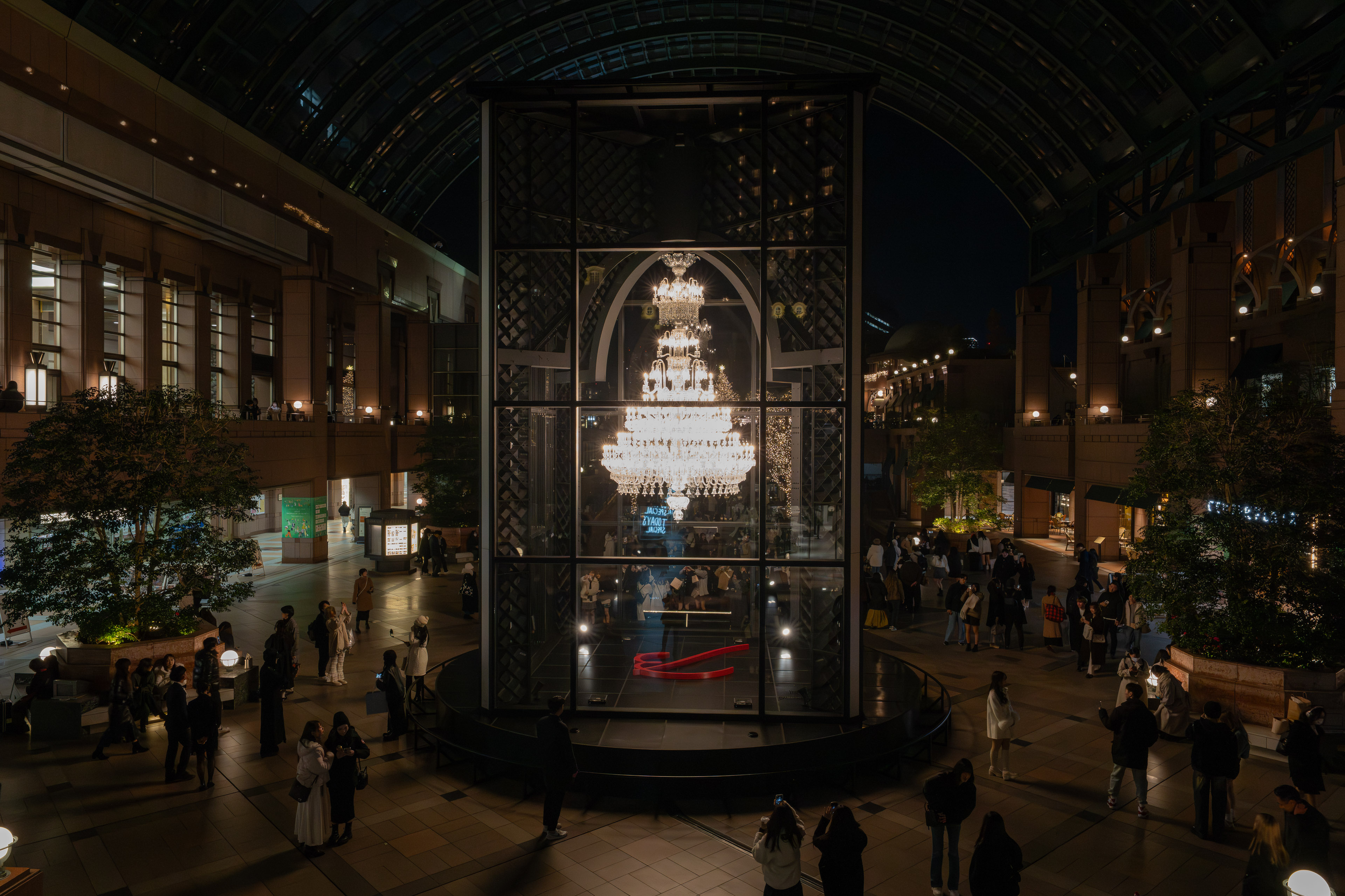 バカラシャンデリアが設置されるセンター広場を覆うのは、巨大なガラス屋根です。緩やかな曲線を描くこの屋根は、周囲の直線的な高層ビルと対照的で、空間に柔らかさを与えています。