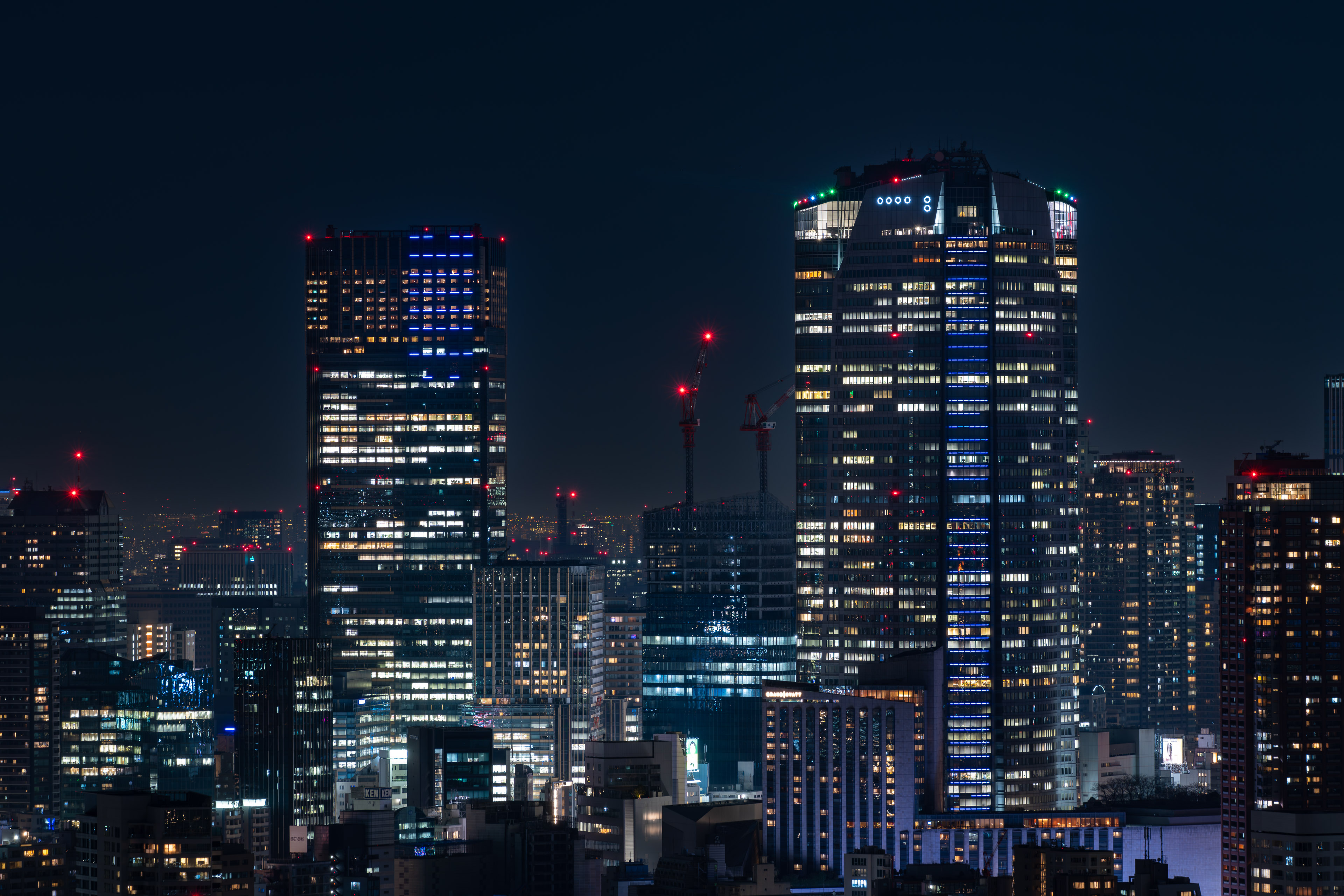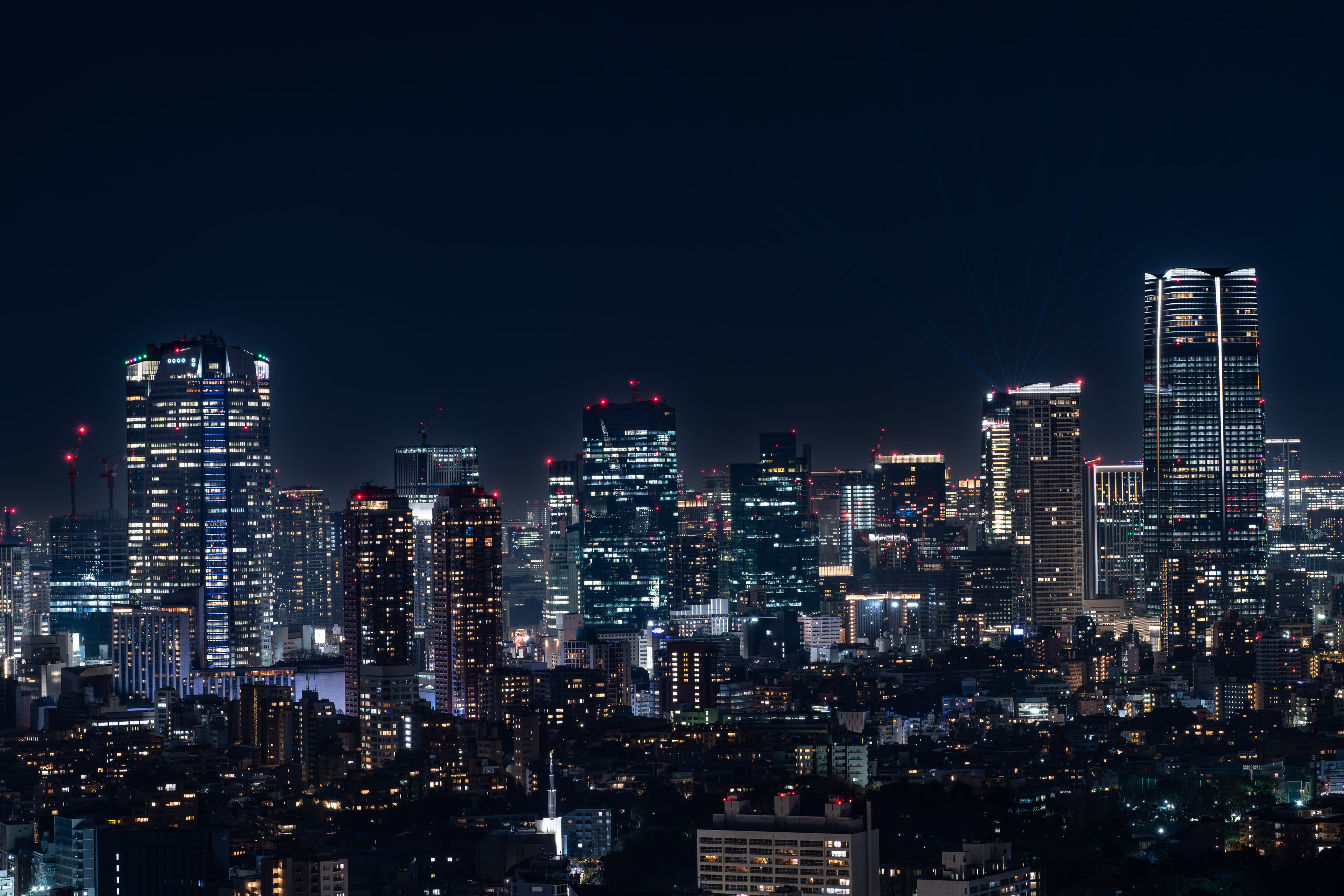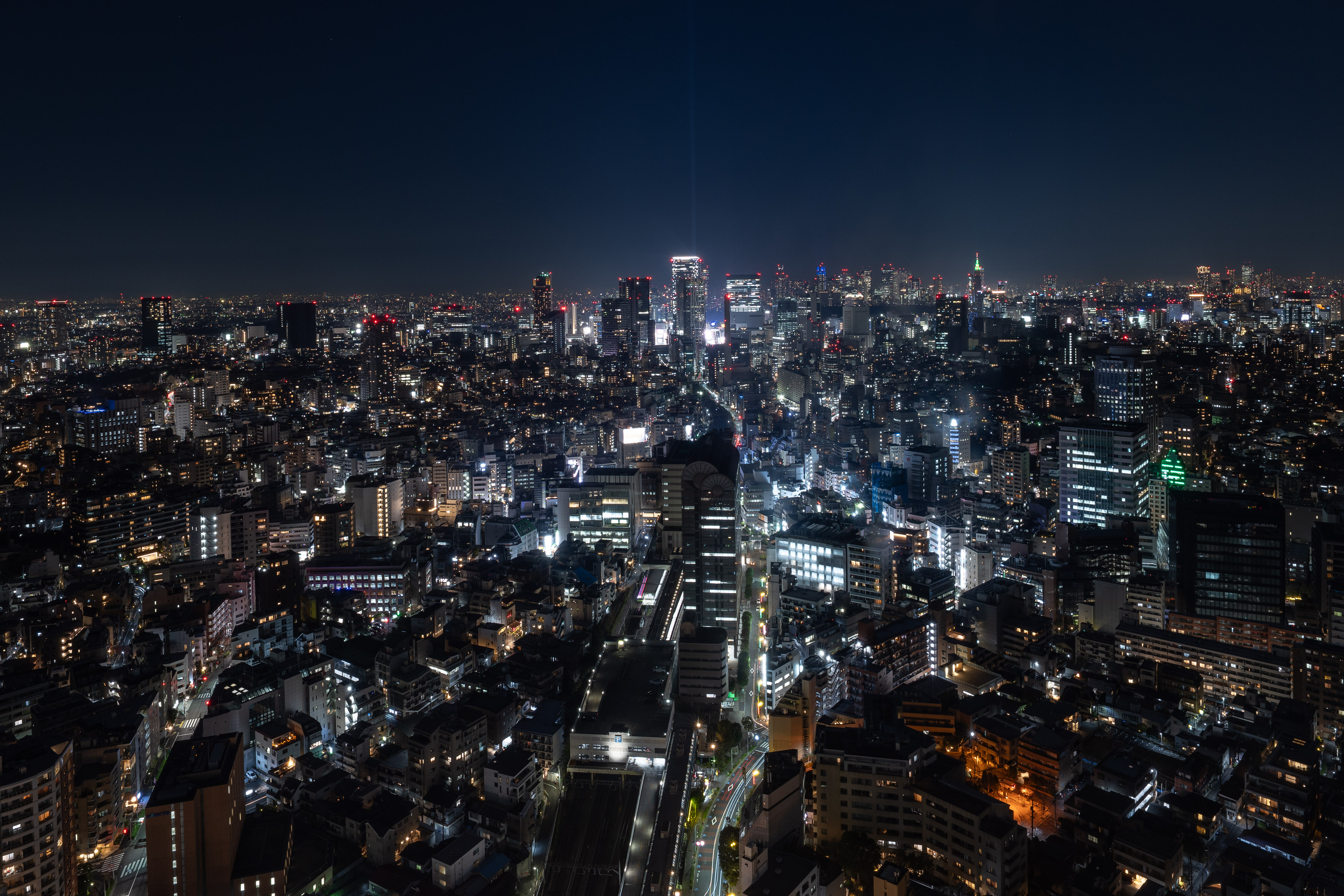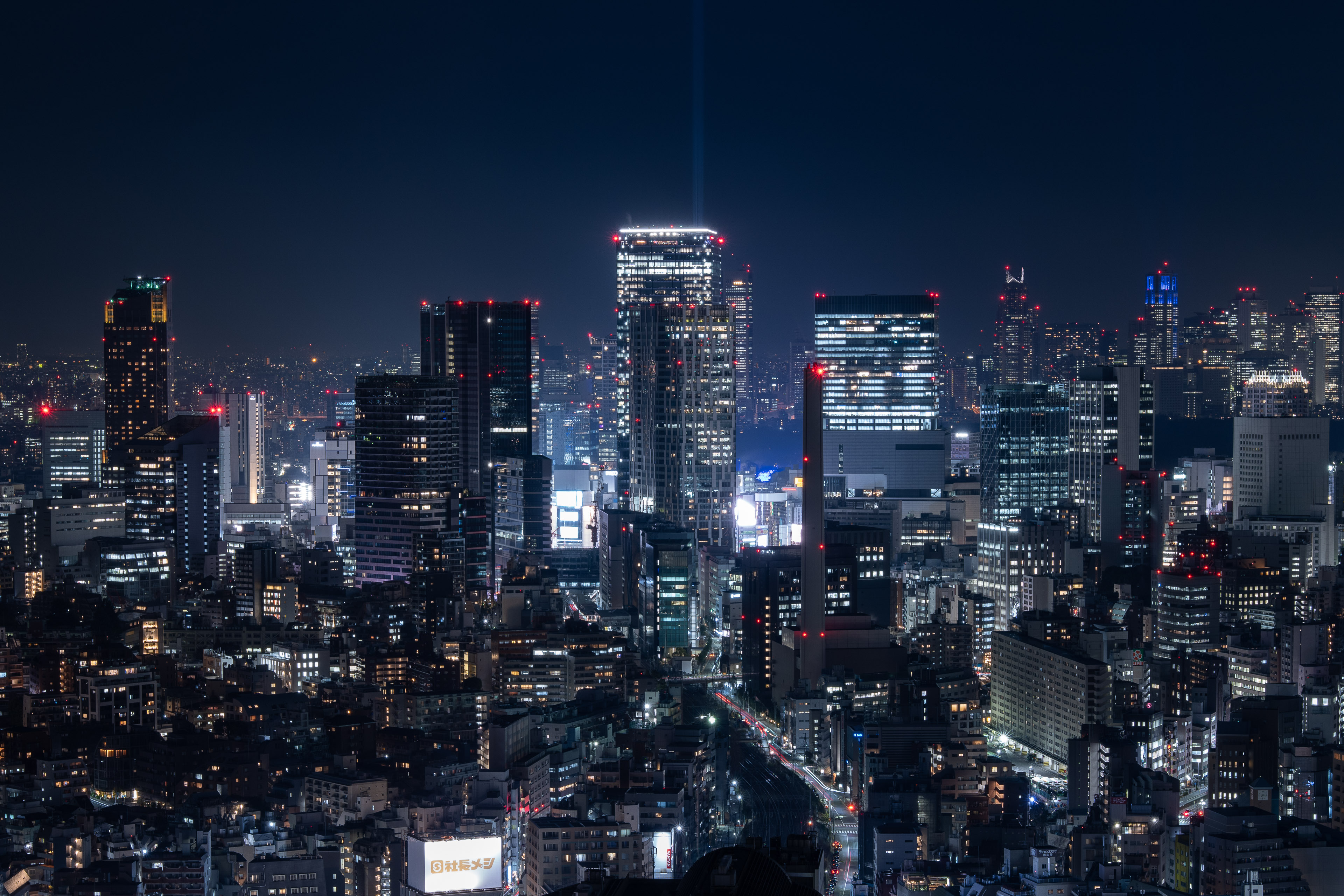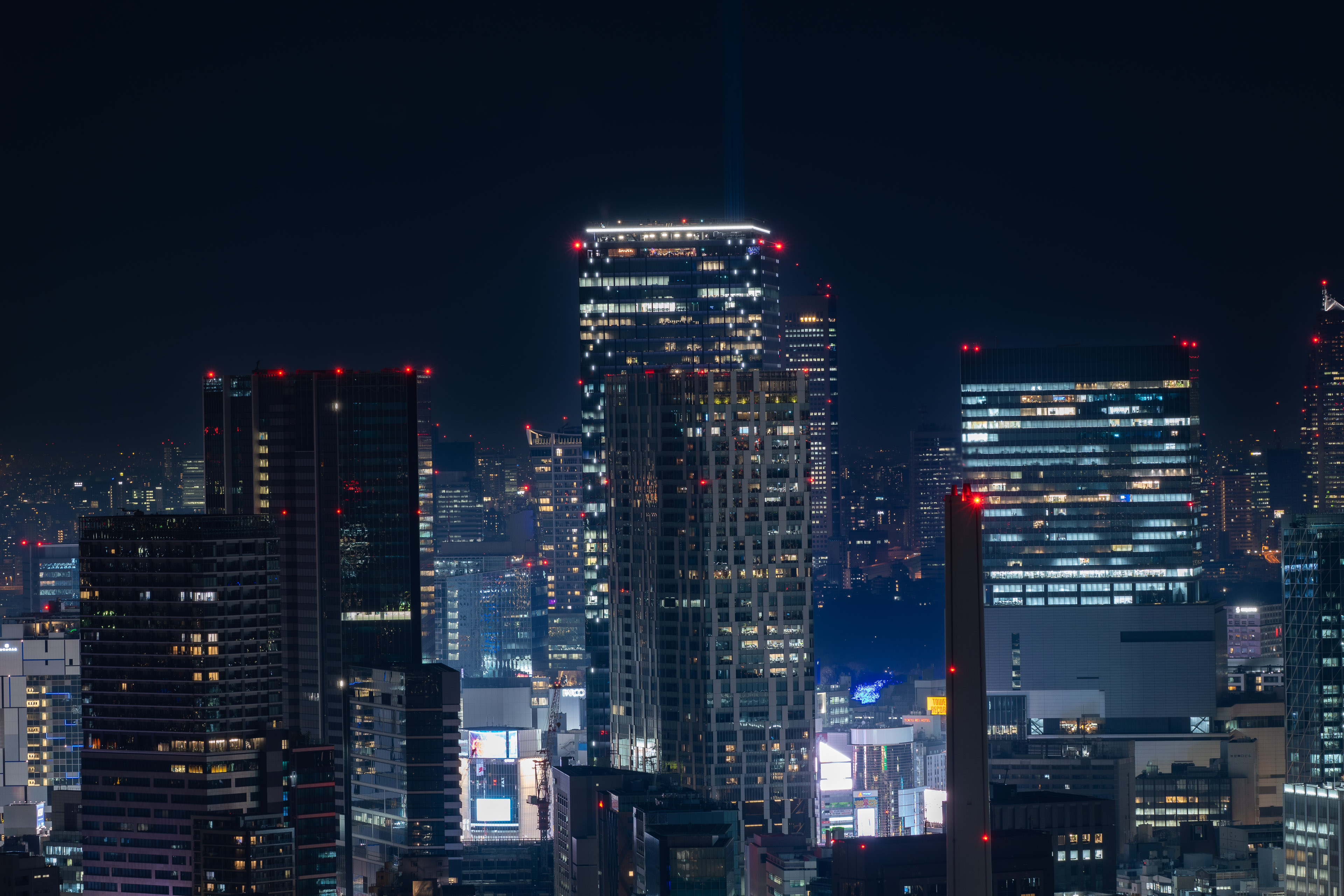 渋谷方面。天空に光線を放っているのは渋谷スカイ。
