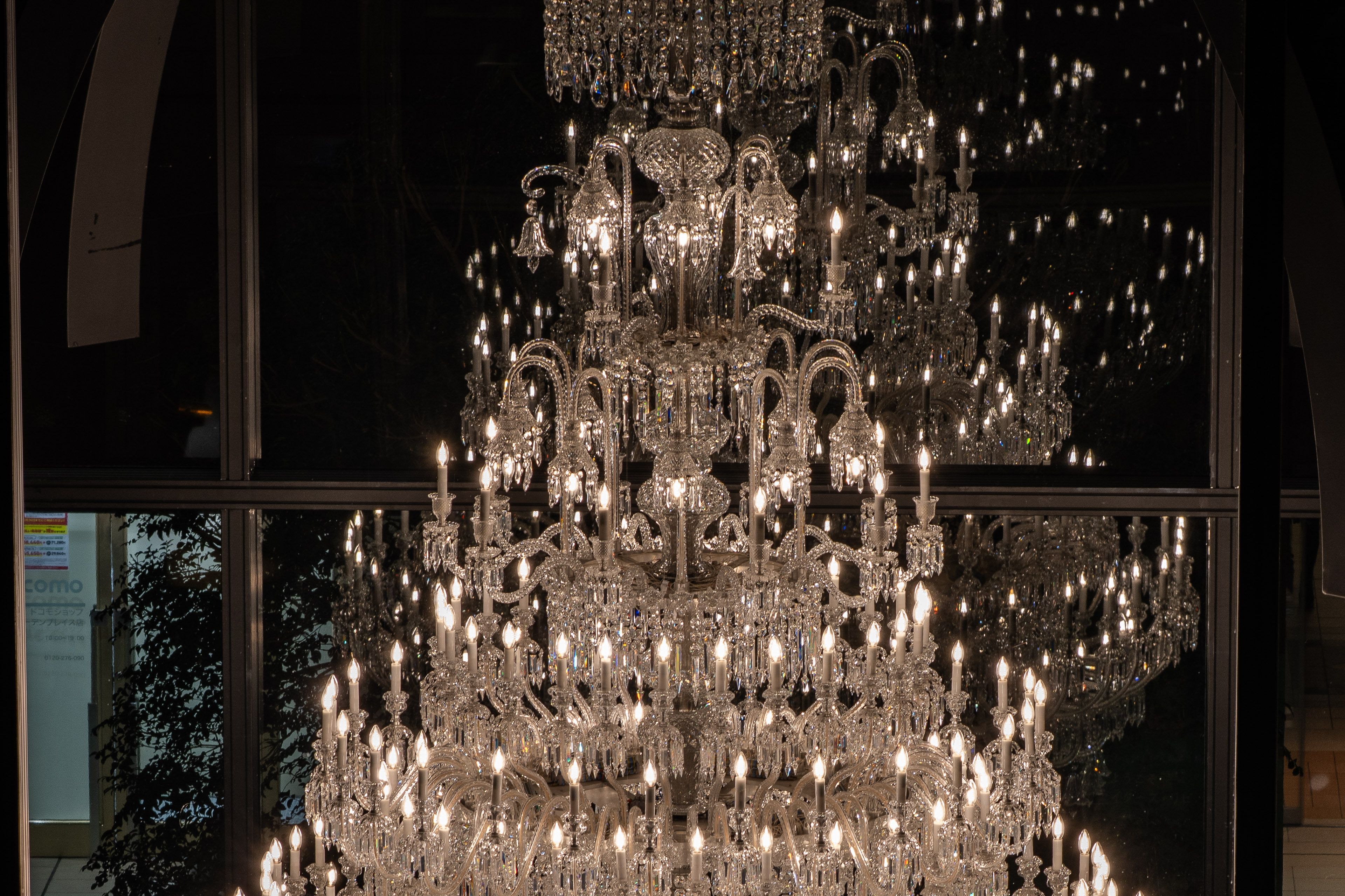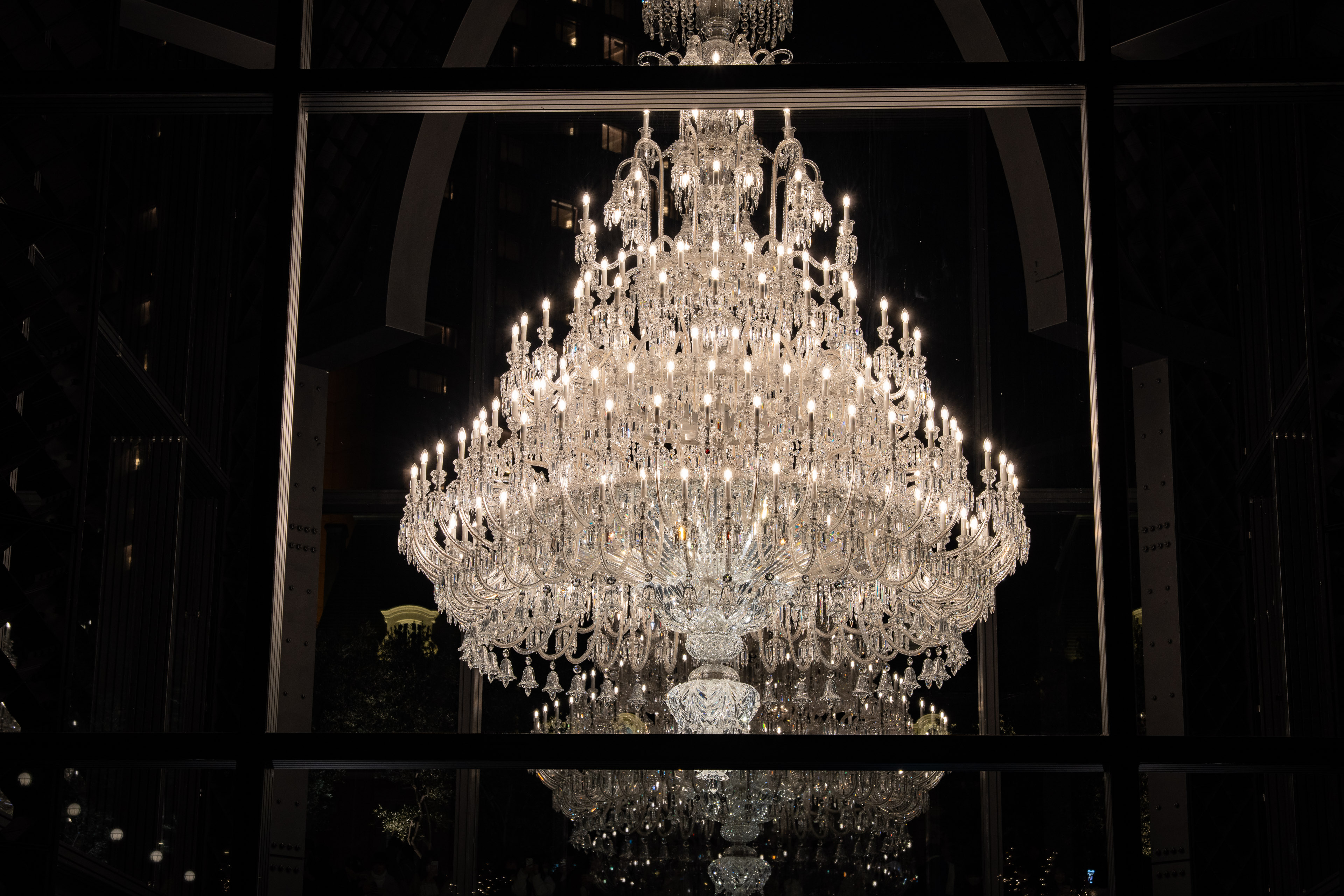 シャンデリアは防護用のガラスケースに収められており、直接触れることはできません。