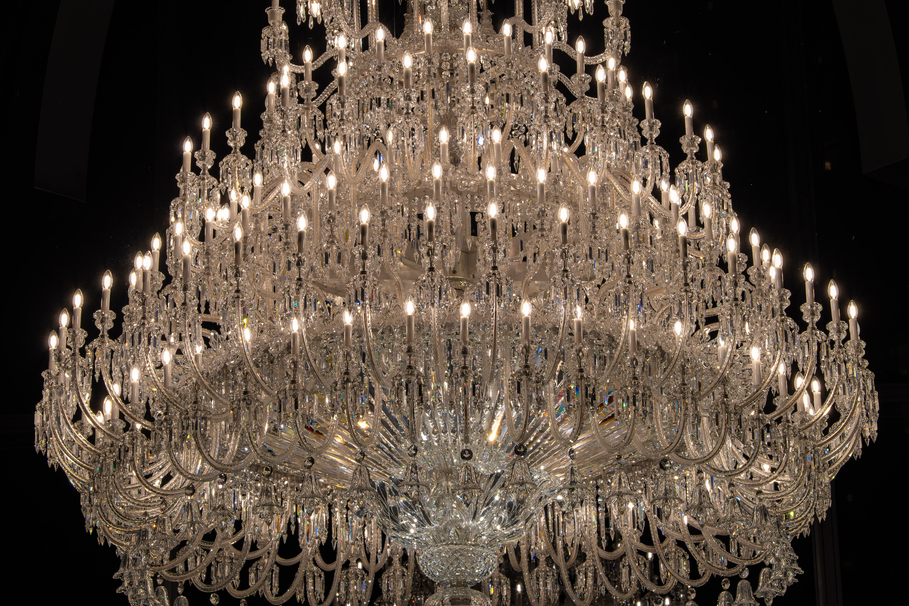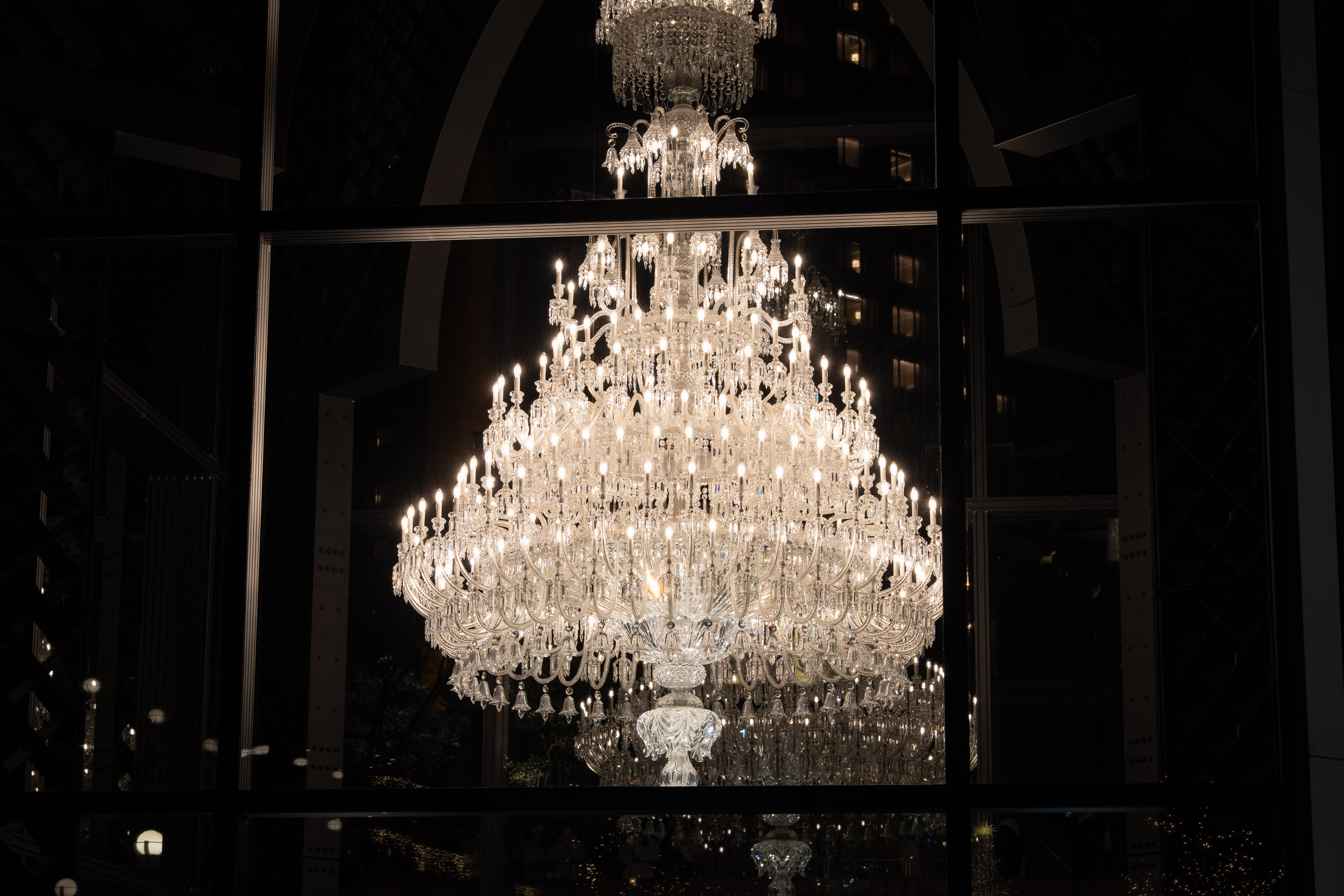 高さ約5メートル、幅約3メートル。クリスタルパーツの数は8,000ピースを超え、ライトの数は250灯。この巨大な芸術作品は、フランスのバカラ村から海を越えて運ばれてきます。