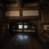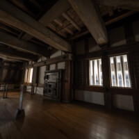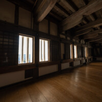 床は堅く黒光りし、人の往来と長い時間の積み重ねを感じさせる。窓から差し込む柔らかな光と暗がりとのコントラストは、木造城郭の内部特有の静謐な雰囲気を作り出している。