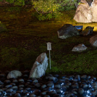 水面に沿ってLEDの線が蛇行しながら奥へ伸びていて、水面がそれを映してもう一本の揺らめく線を作っている。光と、光の影が水に描かれているわけですな。水は光を透かす繊細なレース、と言いましょうか……池そのものがキャンバスになって、光が絵を描いている。